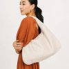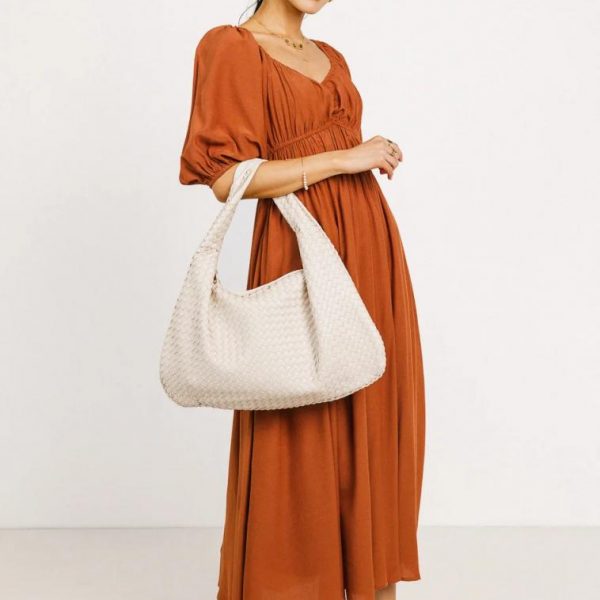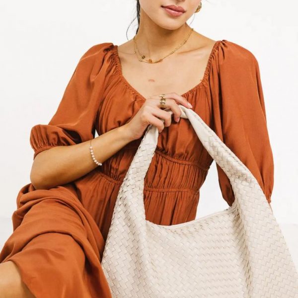 Woven Vegan Leather Vegan Leather Strap Gold Colored Zipper Closure Slouch Shape Fabric Lined Inner Zipper Pocket Inner Slip Pocket Height: 10.63″, Width: 1.57″, Length: 19.29″