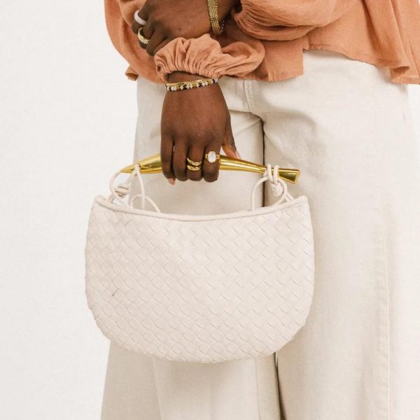 Woven Vegan Leather Brass Handle Crossbody Strap Magnetic Closure Lined Inner Zipper Pocket Height: 6.7″, Width: 1.19″, Length: 10.63″