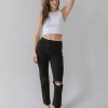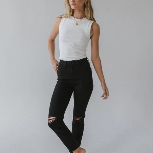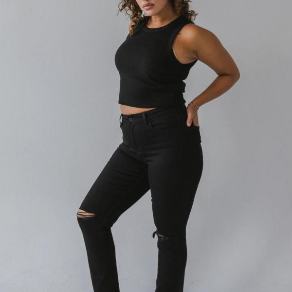 High Rise Button and Zipper Closure Front and Back Pockets Distressed Knees and Hem Straight Leg Stretch Material 78% Cotton, 20.4% Polyester, 1.6% Spandex Machine Wash Cold, Tumble Dry Low Model Info Height: 5’7″ 5’8″ Wearing Size: 25,27,29