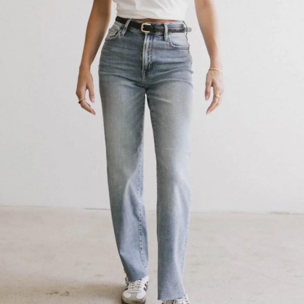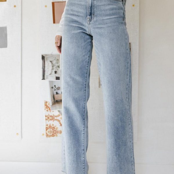 High Rise Button and Zipper Closure Wide Leg Raw Hem Stretch Material 93% Cotton, 5% Polyester, 2% Spandex Machine Wash Cold, Tumble Dry Low Model Info Height: 5’9″ Wearing Size: 24
