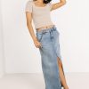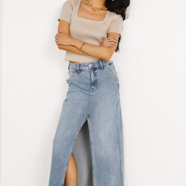 Light Wash Denim Skirt Button and Zipper Closure Belt Loops Two Front and Two Back Pockets Front 23″ Leg Slit Slight Stretch Material 100% Cotton Hand Wash, Hang Dry  Make room in your closet for the Capone Denim Maxi Skirt. This denim staple is easy to style and makes any outfit look trendy. Grab a simple henley shirt, some strappy sandals and accessorize. Model Info Height: 5’8″  Wearing Size: Small
