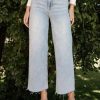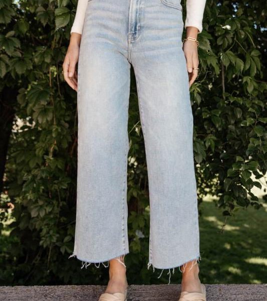 High Rise Denim Jeans Wide Leg Fit Button & Zipper Closure Cropped Fit Raw Hem Detail Stretch Material 93% Cotton, 5% Polyester, 2% Spandex Machine Wash Cold Inside Out, Tumble Dry Low Model Info Height: 5’7″ and 5’8″ Wearing Size: 25, 26, 31