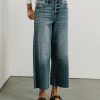 High Rise Denim Jeans Wide Leg Fit Button & Zipper Closure Cropped Fit Raw Hem Detail Stretch Material 93% Cotton, 5% Polyester, 2% Spandex Machine Wash Cold Inside Out, Tumble Dry Low Model Info Height: 5’8″ Wearing Size: 25 Measurements: Waist: 28″, Rise: 10.5″, Inseam: 24.5″