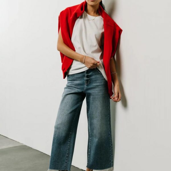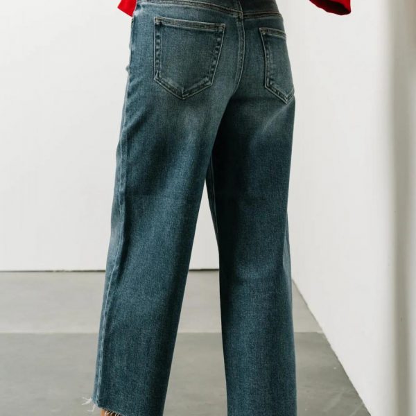 High Rise Denim Jeans Wide Leg Fit Button & Zipper Closure Cropped Fit Raw Hem Detail Stretch Material 93% Cotton, 5% Polyester, 2% Spandex Machine Wash Cold Inside Out, Tumble Dry Low Model Info Height: 5’8″ Wearing Size: 25 Measurements: Waist: 28″, Rise: 10.5″, Inseam: 24.5″