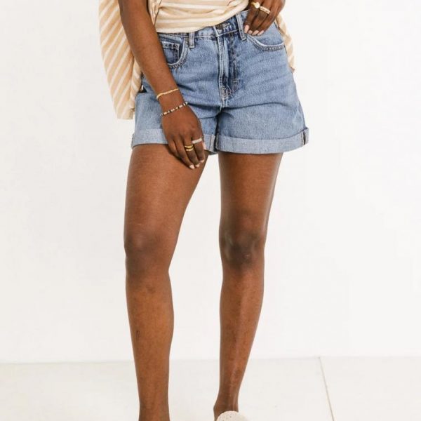 High Rise Mom Short Distressed Detailing on Back and Front Pockets Zipper and Button Closure Rolled Hem Non Stretch Denim Material 100% Cotton Machine Wash Cold, Tumble Dry Low Its that time of year again and the Edie High Rise Denim Shorts are summer staples. As the weather gets warmer, grab your favorite sandals and style these shorts with a peplum style blouse. Model Info Height: 5’5″ Wearing Size: X-Small