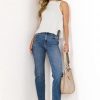 High Rise Button and Zipper Closure Straight Leg Raw Hem Stretch Material 93% Cotton, 5% Polyester, 2% Spandex Machine Wash Cold, Tumble Dry Low Model Info Height: 5’7″ 5’8″ Wearing Size: 25-27-29