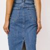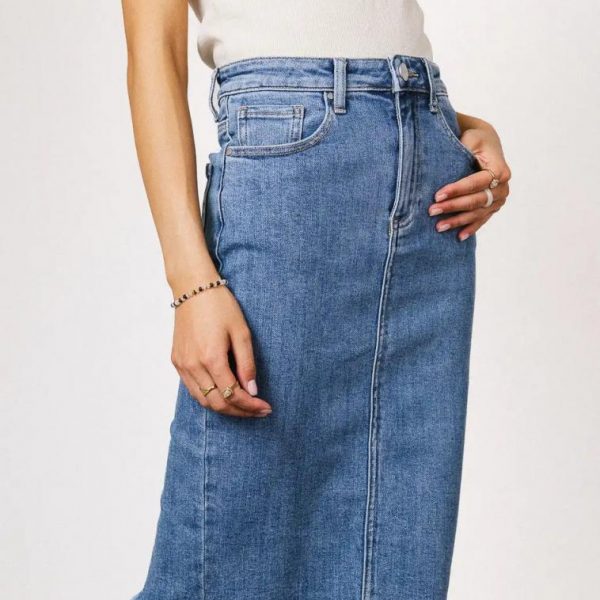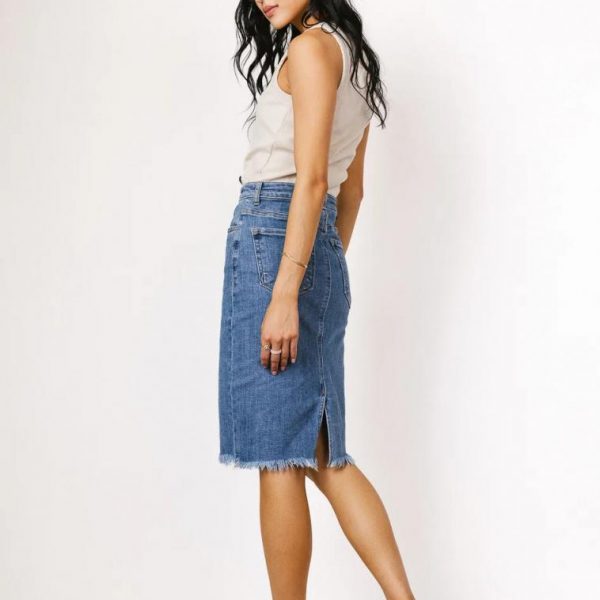 Midi Skirt Two Front Pockets Two Back Pockets Belt Loops Distressed Hem 6″ Slit on Back Slight Stretch Material 95% Cotton, 3.5% Polyester, 1.5% Spandex Machine Wash Cold, Hang Dry Take your wardrobe to the next level with the Frida Denim Midi Skirt. We love how the distressing on the hem keeps this midi a casual everyday piece. Pair with a striped tee and some sneakers. Model Info Height: 5’8″ Wearing Size: Small