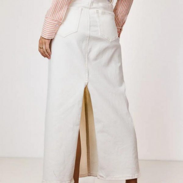 Denim Midi Skirt Button and Zipper Closure Two Hand Pockets Two Back Pockets Back Slit 98% Cotton, 2% Spandex Turn Inside Out, Machine Wash Cold, Tumble Dry Low  Model Info We love our neutrals and for that reason, we love the Harley Midi Skirt in Cream. This skirt is perfect for casual occasions. Keep things simple with a basic tee and some sandals for a summery minimalist look.   Height: 5’7″  Wearing Size: Small