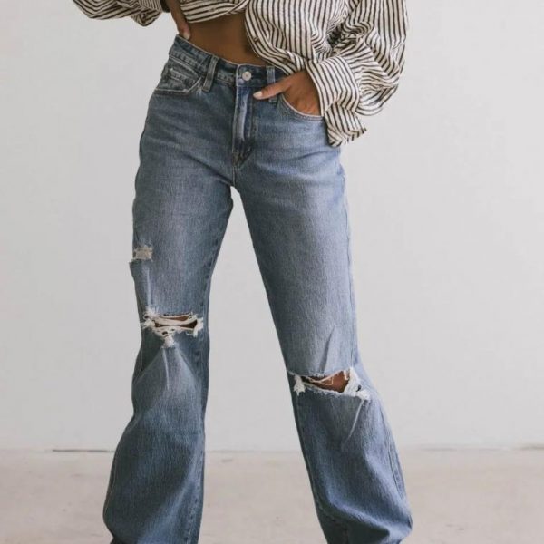 High Rise Distressed Rip Zipper, Button Closure Two Front, Two Back Pockets Slight Stretch Material Long Length Fit 99% Cotton, 1% Spandex Machine Wash Cold, Tumble Dry Low  Model Info Height: 5’8″ Wearing Size: 24 Size 24 Measurements: Waist: 28″, Rise: 10.5″, Inseam: 33.5″