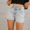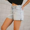 Mom Short Crossover Waist Distressed Detailing on Back and Front Pockets Zipper and Two Button Closure Rolled Raw Hem Non Stretch Denim Material 100% Cotton Machine Wash Cold, Tumble Dry Low  As temps rise, so do our inseams, that’s why we love the Reya Crossover Denim Shorts. These light wash bottoms feature an asymmetrical hem to keep things fresh. Grab you’re staple platform sneakers and tote bag to style these shorts. Model Info Height: 5’7″ Wearing Size: X-Small