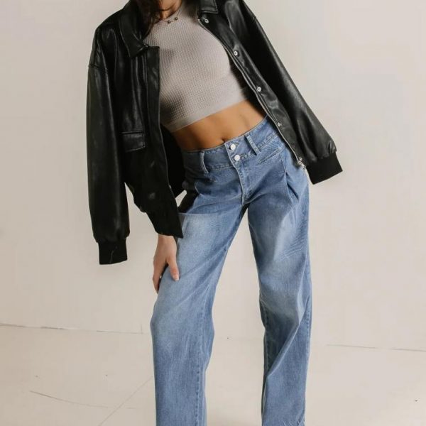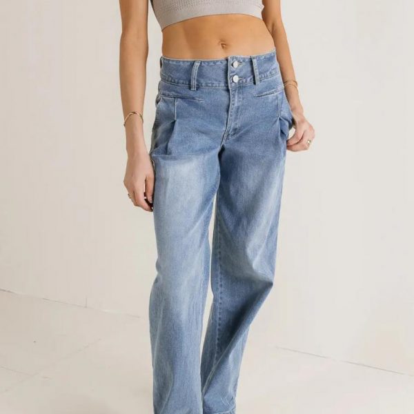 High Rise Two Front Slit Hand Pockets Front Pleat Detail Two Button and Zipper Closure Two Functioning Back Pockets Slight Distressed Detailing Stretch Material 70% Cotton, 28% Polyester, 2% Spandex Hand Wash Cold, Line Dry Model Info: Height: 5’7″ Wearing Size: Small