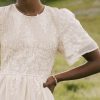Round Neck Short Flutter Sleeves Smocked Bodice Embroidered Flowers Tulle Material Elastic Waist Lined Back Keyhole Closure 100% Polyester Hand Wash Cold, Line Dry Model Info Height: 5’8” and 5’5” Wearing Size: X-Small