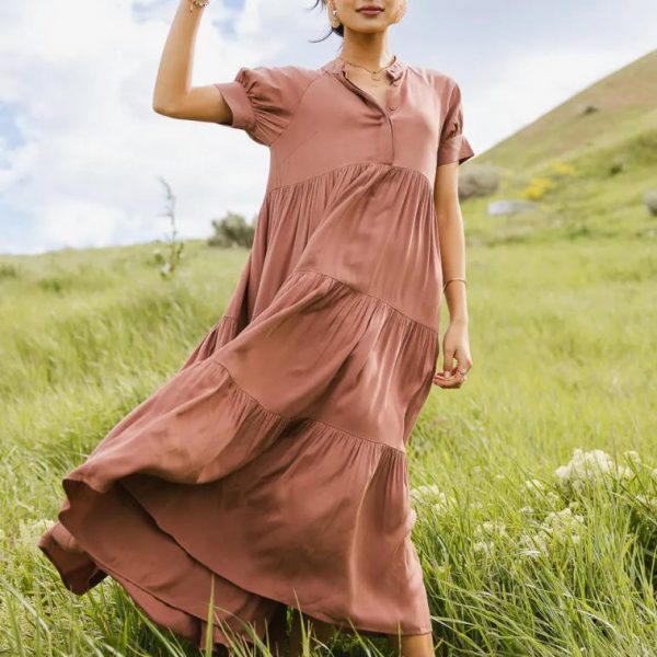 Tiered Midi Dress Round Neck Short Sleeve Functional Front Buttons  Loose, Oversized Fit  Non-Stretch Material 100% Rayon Hand Wash Cold, Line Dry   Model Info Height: 5’8″ Wearing size: Small