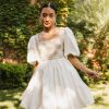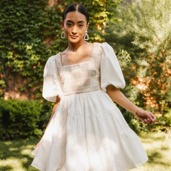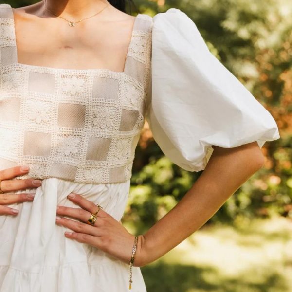 Square Neckline Checkered Pattern Bodice Floral Lace Fitted Bodice Side Zipper Lined Tiered Skirt Short Puff Sleeves Self: 100% Cotton Contrast: 60% Cotton, 40% Polyester Lining: 70% Polyester, 30% Cotton Hand Wash Cold, Line Dry Model Info Height: 5’8″ Wearing Size: X-Small
