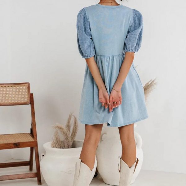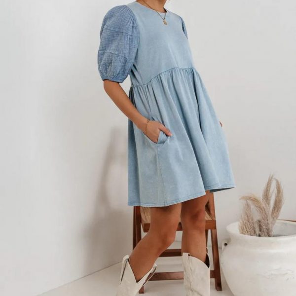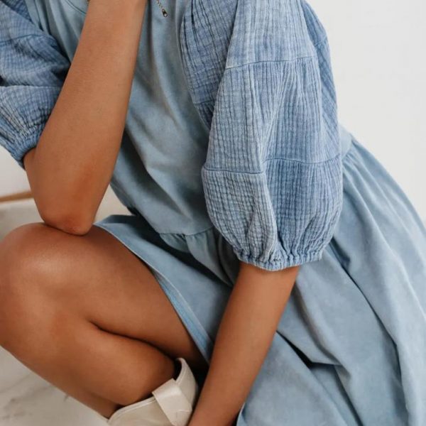 Round Neckline Short Textured Linen Sleeve Puff Sleeves with Elastic Cuffs Smocked Back Waist Seam with Gathers Back Seam on Skirt Unique Dye Treatment Self: 100% Cotton, Contrast: 100% Cotton Machine Wash Cold, Line Dry  Model Info  Height: 5’8″  Wearing Size: Small  Measurements: Bust: 36″, Waist: 34″, Length 32.5″  **For more specific information on the product, please feel free to email us at webteam@ bohme