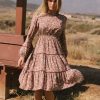 Round Neckline Long Sleeves Contrast Trim Three Tiered Skirt Back Keyhole Closure Lined, Except For Sleeves Self: 100% Rayon Lining: 100% Polyester  Hand Wash Cold, Line Dry  Model Info  Height: 5’9″  Wearing Size: Small