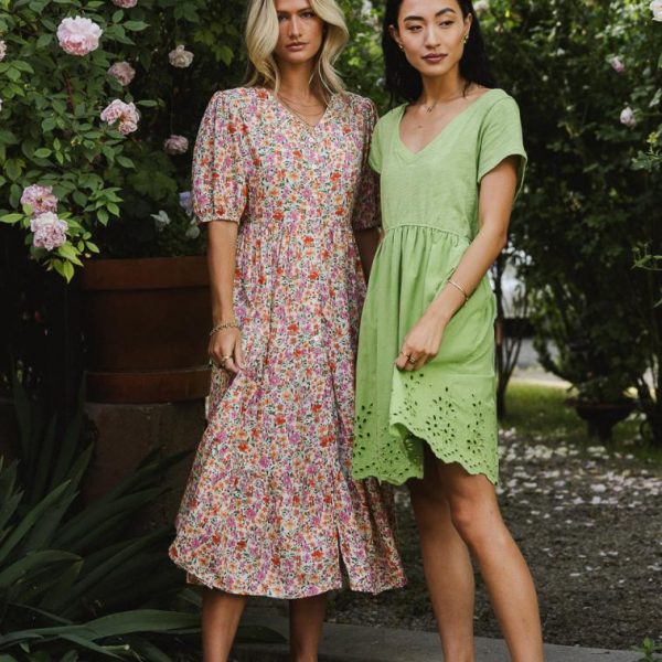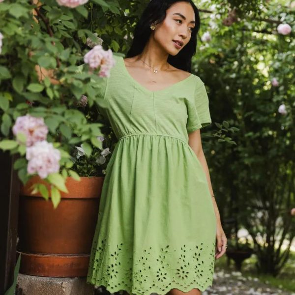 V Neckline Back Strap Panel Seam Detail Elastic Waist Band Two Raw Hem Hand Pockets Eyelet Lace Fully Lined Shell: 100% Cotton Lining: 100% Rayon Hand Wash Cold, Line Dry  The Aria Eyelet Lace Mini Dress in Green is a vibrant take on a boho must have. This dress will have you feeling absolutely free. Pair with a platform sneaker and a layering base. Model Info Height: 5’8″ Wearing Size: X-Small Fit: True to size