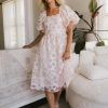 Square Neckline Short Puff Sleeve Elastic Sleeve Cuff Elastic Shoulder Smocked Back Fully Lined Floral Pattern Self: 100% Polyester Lining: 100% Polyester  What can we say about the Beckett Floral Midi Dress that isn’t already obvious? This dress is absolutely stunning. This dress is perfect for more formal occasions. Pair with a nude heel and some gold jewelry. Model Info Height: 5’7″ Wearing Size: X-Small