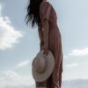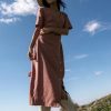 Surplice Neckline and Bodice Short Sleeves Notch Slit Bottom Hem 10 Functional Button Closure 3″ Waist Tie Ribbed Material Self: 100% Lyocell; Lining: 100% Polyester Machine Wash Cold, Line Dry Fit: Runs big The Bhar Wrap Midi Dress in Clay is the definition of sophisticated. From wedding guest to managing partner, this dress adapts to all of your roles. We recommend styling with some bold flats and a sleek claw clip. Model Info Height: 5’7″ Wearing Size: X-Small
