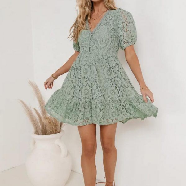 V-Neck with Scalloped Short Puff Sleeves with Elastic Cuff Functioning Front Buttons Tiered Skirt Lined Sleeves Not lined Shell: 40% Nylon, 40% Cotton, 20% Rayon; Lining: 100% Polyester Hand Wash Cold, Lay Flat to Dry Model Info Height: 5’7″ Wearing Size: Small Measurements: Bust: 36″, Waist: 30″, Length: 33″ **For more specific information on the product, please feel free to email us at webteam@ bohme