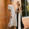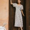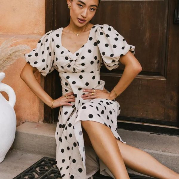 Sweetheart Twist Front Neckline Front Peek-a-Boo Cutout Short Puff Sleeves with Elastic Cuff Back Zipper, Hook and Eye A-Line Silhouette Polka Dot Pattern Fully Lined Self: 70% Viscose, 30% Linen Lining: 100% Rayon Hand Wash Cold, Line Dry Model Info Height: 5’8″ Wearing Size: Small Fit: Small