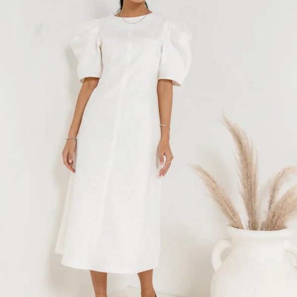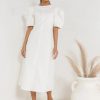 Round Neckline Short Puff Sleeves Back Keyhole Button Closure Side Zipper Closure Midi Length Slight Stretch Material 80% Cotton; 18% Polyester; 2% Spandex Hand Wash Cold, Line Dry  Your search for the cutest denim dress is over. Introducing the Campbell Denim Dress in Cream. We’re absolutely smitten by the puff sleeves and flattering shape this midi offers. Style with some chunky heels and minimal jewelry. Model Info  Height: 5’5″  Wearing Size: Small