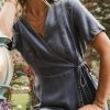 Wrap Style V Neck Bust Snap Button Closure Inner Wrap Button and Loop Outer Tie Fastening Back Elastic Waist Short Sleeves Two Hand Pockets Non Stretch Material 100% Tencel Hand Wash Cold, Flat Dry  Model Info Height: 5’7″ Wearing Size: Small