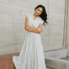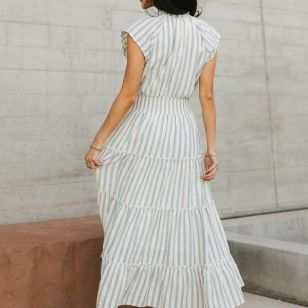 V Neck with Ruffled Neckline Smocked Waistline Short Cap Sleeves Four Tiered Skirt  Ruffle Midi Lined Skirt Striped Pattern Shell: 90% Cotton, 5% Polyester, 5% Linen Lining: 100% Cotton Machine Wash Cold, Hang Dry  Model Info Height: 5’8″ Wearing Size: X-Small
