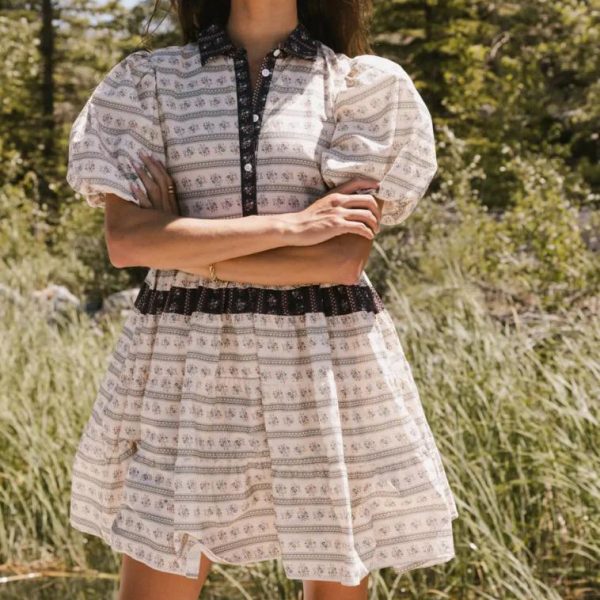 Collared Neckline Five Button Bodice Closure Striped and Floral Print Short Puff Sleeve Two Hand Pocket Lined Skirt and Sleeves Unlined Bodice Non Stretch Material Self, Contrast, Lining: 100% Cotton Hand Wash Cold, Hang Dry  Model Info Height: 5’8″ Wearing Size: X-Small