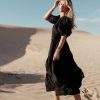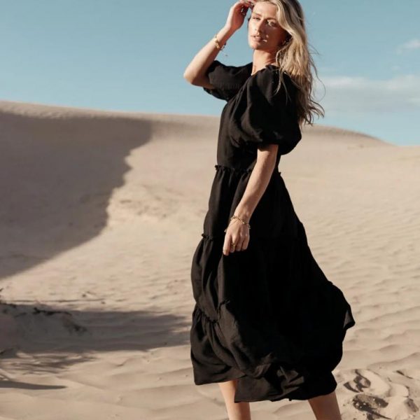 Elastic Round Neckline Textured Material Tiered Skirt With Ruffles Short Puff Sleeves Elastic Sleeve Cuffs Fully Lined Non-Stretch Shell and Lining: 100% Polyester Machine Wash Cold, Tumble Dry Low The Corinne Tiered Maxi Dress in Black is your wardrobe’s next must-have. It was made for formal events, as the tiers create the most beautiful silhouette. This dress goes best with a pair of elegant heels and a hand bag. Model Info Height: 5’7″ Wearing Size: X-Small