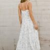 Adjustable Spaghetti Straps Floral Pattern White Floral Embroidery Three Ruffled Tiers Drop Waist with Halter Bust 8 Faux Buttons on Bodice Fully Lined, Still Slightly See Through Non Stretch Material Back Zipper, Hook and Eye Closure Self, Lining: 100% Polyester Hand Wash Cold, Hang Dry Model Info Height: 5’7″ Wearing Size: Small