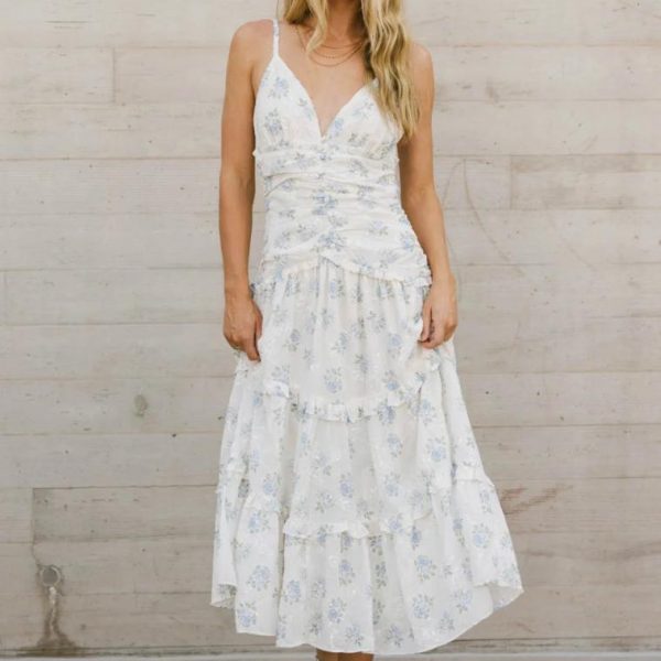 Adjustable Spaghetti Straps Floral Pattern White Floral Embroidery Three Ruffled Tiers Drop Waist with Halter Bust 8 Faux Buttons on Bodice Fully Lined, Still Slightly See Through Non Stretch Material Back Zipper, Hook and Eye Closure Self, Lining: 100% Polyester Hand Wash Cold, Hang Dry Model Info Height: 5’7″ Wearing Size: Small