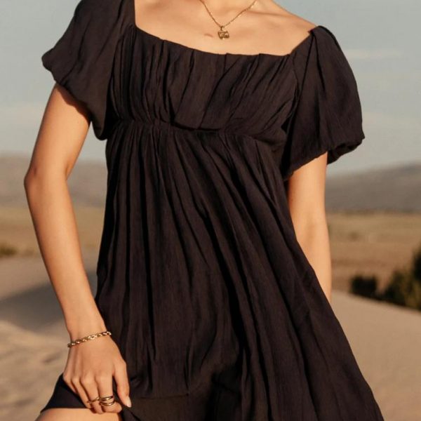 Pleated Square Neckline Short Puff Sleeves Elastic Shoulders Elastic Under-Bust Smocking on Back of Bodice Fully Lined Shell: 75% Rayon, 25% Nylon Lining: Cotton Hand Wash Cold, Lay Flat to Dry Th Dasha Textured Mini Dress in Navy is a must-have in your closet. The versatile and flattering shape makes it perfect for any sunny day activity. This deep blue dress is best complimented by a pair of camel suede heels and a matching bag. Model Info Height: 5’8″ Wearing Size: Small