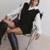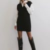 Collared Neckline Long Sleeves Four Button Closure Attached Sweater Vest  Contrast Material Skirt Non Stretch Materials Self: 74% Acrylic, 22% Polyester 4% Spandex Contrast: 100% Cotton Hand Wash Cold Water, Hang to Dry   Model Info Height: 5’9″ Wearing Size: Small