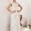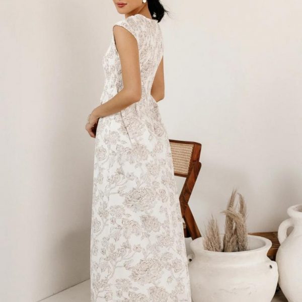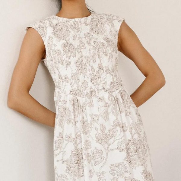 Crew Neckline Smocked Bodice Floral Pattern Invisible Zipper Closure Lined Non Stretch Material Self: 100% Cotton; Lining: 100% Cotton Hand Wash Cold, Lay Flat to Dry  The Elias Smocked Maxi Dress is your wedding season plus one. This dress over performs in settings both casual and formal. Style it with a pair of tan heels and gold jewelry to complete this elegant look. Model Info  Height: 5’8″  Wearing size: Small