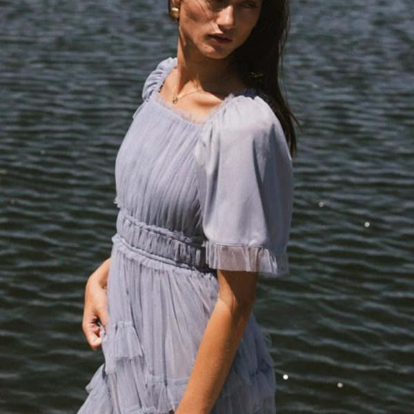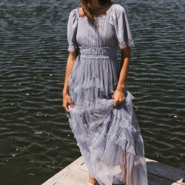 Square Neckline Tulle Ruffled Short Sleeves Elastic Waist Five Ruffled Tiered Skirts Fully Lined Self, Lining: 100% Polyester Hand Wash Cold, Lay Flat to Dry Model Info Height: 5’8″ Wearing Size: X-Small