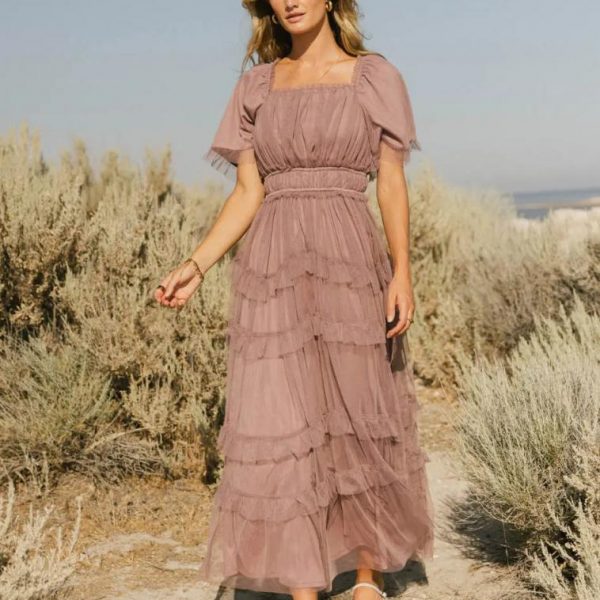 Square Neckline Tulle Ruffled Short Sleeves Elastic Waist Five Ruffled Tiered Skirts Fully Lined Self, Lining: 100% Polyester Hand Wash Cold, Lay Flat to Dry  Model Info Height: 5’7″ Wearing Size: X-Small