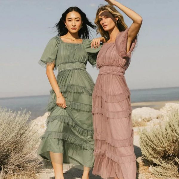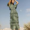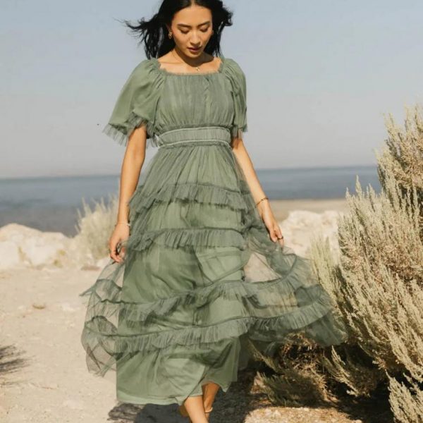 Square Neckline Tulle Ruffled Short Sleeves Elastic Waist Five Ruffled Tiered Skirts Fully Lined Self, Lining: 100% Polyester Hand Wash Cold, Lay Flat to Dry Model Info Height: 5’8″ Wearing Size: X-Small