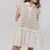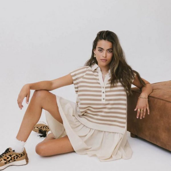 Collared Neckline with V Short Sleeves with Rolled Cuffs Three Button Closure Ribbed Hem and Collar Contrast Material Skirt Non Stretch Materials Shell: 54% Cotton, 46% Polyester Shell 2: 100% Polyester Shell 3: 100% Cotton Hand Wash Cold, Hang Dry Model Info Height: 5’5″ Wearing Size: Small