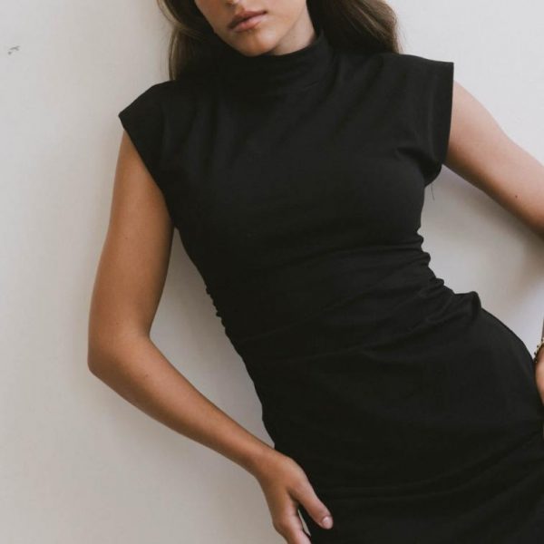 Mock Neck Short Cap Sleeve Ruched Sides Stretch Knit Material 95% Cotton, 5% Spandex Machine Wash Cold, Flat Dry  Model Info Height: 5’5″ Wearing Size: X-Small X-Small Measurements: Bust: 30″, Waist: 23″, Length: 36″