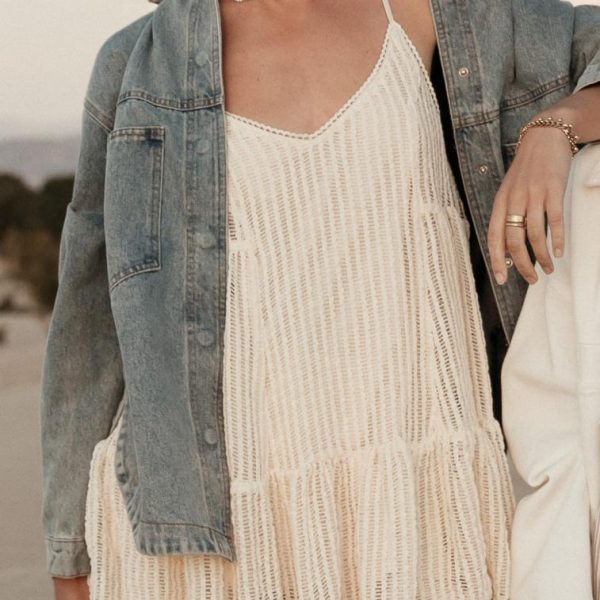 V Neckline Adjustable Spaghetti Straps Tiered Skirt Fully Lined, Still See Through Fitted Bust Crocheted Shell Scalloped Hem and Neckline Shell: 95% Polyester, 5% Spandex Lining: 100% Polyester Hand Wash Cold, Hang Dry  Boho has us in a grip this summer and the Fiona Crocheted Mini Dress is the best of the bunch. The ladder stitch crochet gives such a fun texture, and we love the baby doll silhouette. Pair with a platform sandal or a sneaker. Model Info Height: 5’8″ Wearing Size: Small