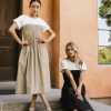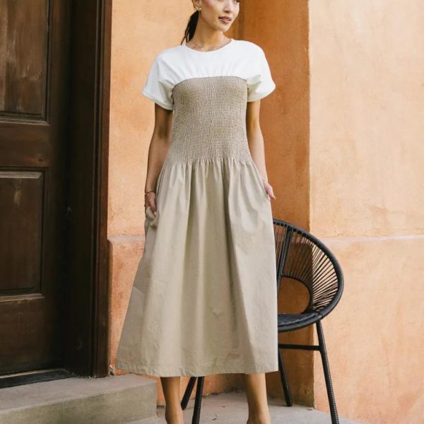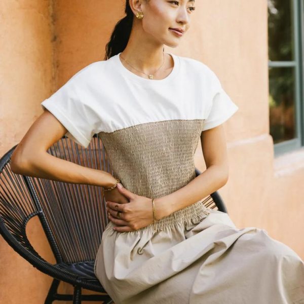 Ribbed Crew Neckline Smocked Bodice Drop Waist Short Sleeves with Rolled Cuff Two Hand Pockets Shoulders Made of Stretch Material Skirt Made of Non-Stretch Material Self: 75% Nylon, 25% Cotton Shoulder Contrast: 100% Cotton Hand Wash Cold, Line Dry Model Info Height: 5’8″ Wearing Size: Small Fit: True to size