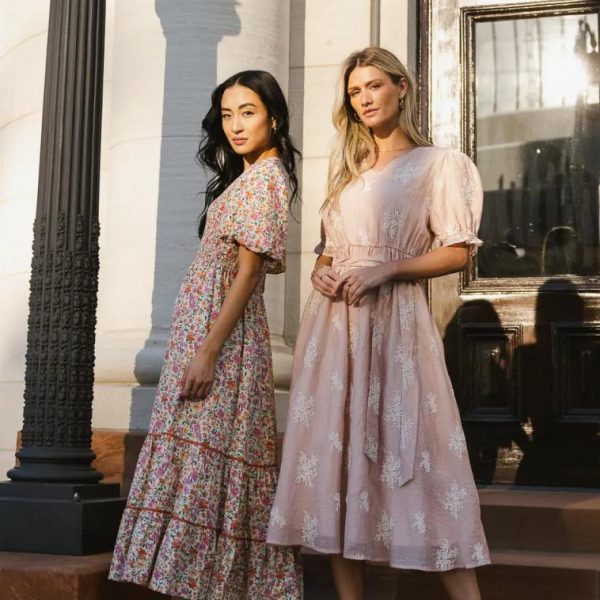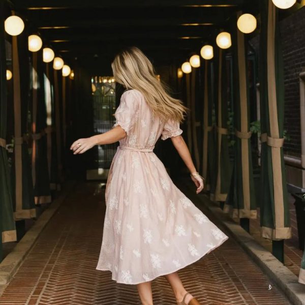 V Neckline Embroidered Elastic Waistband with Waist Tie Short Sleeves with Elastic Cuffs Non Stretch Material Lined Keyhole Closure on Back Self: 90% Polyester, 10% Tencel Lining: 100% Polyester Hand Wash Cold, Flat Dry The Gloria Embroidered Midi Dress is a beautiful addition to any closet. This dress is a great option for wedding goers and stands great on its own. Accessorize with some wedge heels and a simple cross body bag. Model Info Height: 5’7″ Wearing size: Small