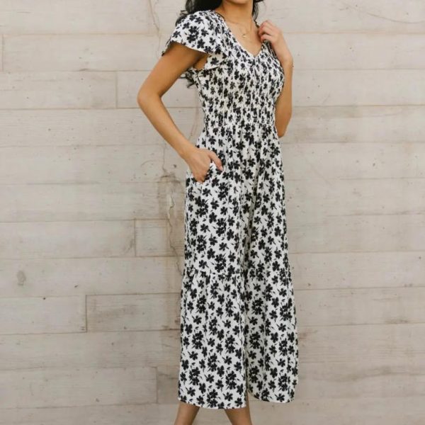 V Neckline Smocked Bodice Short Flutter Sleeves Two Tiered Skirt Two Hand Pockets Underarm Gusset Non Stretch Material Slightly See Through 84% Rayon, 16% Nylon Hand Wash Cold, Hang Dry  Model Info Height: 5’8″ Wearing Size: Small