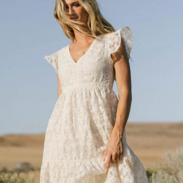 V Neckline Short Flutter Sleeves Floral Lace Lace Trim Left Zipper Closure Non Stretch Material Self: 100% Rayon; Lining: 100% Polyester Hand Wash Cold, Lay Flat to Dry  We cannot contain our adoration for the Isn’t It Lovely Dress in Cream. This stunning dress is perfect for all of your formal events. Style this dress with a pair of heels and a hand bag for a nice dinner look. Model Info  Height: 5’7″  Wearing Size: Small