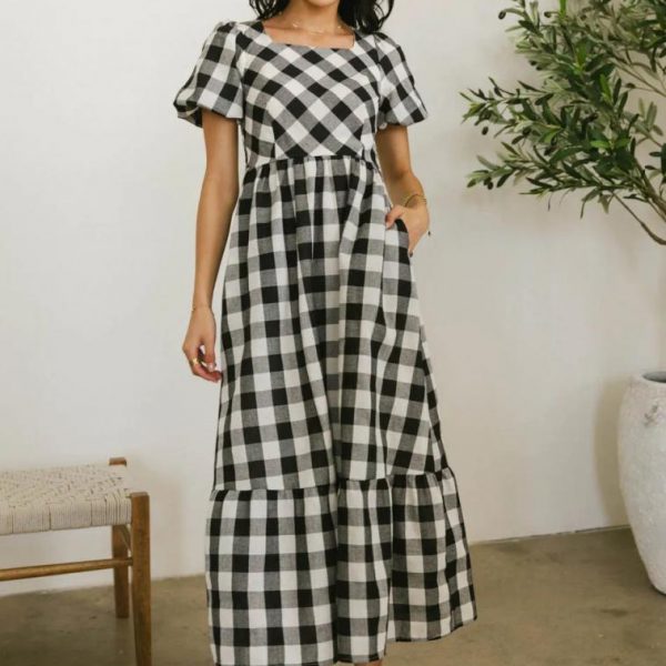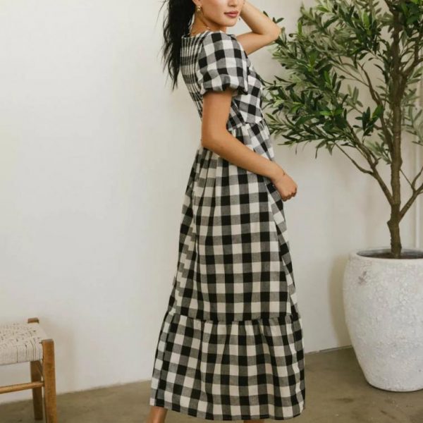 Gingham Print Square Neckline Smocked Back of Bodice Short Puff Sleeves Elastic Sleeve Cuffs Gathered Tier on Skirt Midi Lining Self: 70% Polyester, 30% Cotton Lining: 100% Polyester Hand Wash Cold, Flat Dry  The Jenna Gingham Maxi Dress in Black is as pretty as a picture. This dress is an essential and can be dress up or down with ease. Pair with a simple flat shoe for an outdoor wedding guest look. Model Info Height: 5’8″ Wearing Size: X-Small