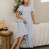 Gingham Print Square Neckline Smocked Back of Bodice Short Puff Sleeves Elastic Sleeve Cuffs Gathered Tier on Skirt Midi Lining Self: 70% Polyester, 30% Cotton Lining: 100% Polyester Hand Wash Cold, Flat Dry  Lovely and bright, the Jenna Gingham Maxi Dress in Blue is perfect for a sunny summer day. This dress is sweet and can be styled for many different events. Make this dress your wedding guest plus one with pair of heels and a hand bag. Model Info Height: 5’8″ Wearing Size: X-Small