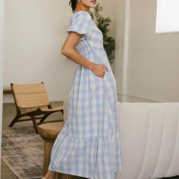 Gingham Print Square Neckline Smocked Back of Bodice Short Puff Sleeves Elastic Sleeve Cuffs Gathered Tier on Skirt Midi Lining Self: 70% Polyester, 30% Cotton Lining: 100% Polyester Hand Wash Cold, Flat Dry  Lovely and bright, the Jenna Gingham Maxi Dress in Blue is perfect for a sunny summer day. This dress is sweet and can be styled for many different events. Make this dress your wedding guest plus one with pair of heels and a hand bag. Model Info Height: 5’8″ Wearing Size: X-Small