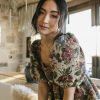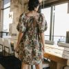 Square Neckline Back Tie Detail Short Puff Sleeves with Elastic Cuffs Empire Waistline Two Hand Pockets Non Stretch Material Lined Self: 90% Polyester, 10% Cotton; Lining: 100% Cotton Hand Wash Cold, Line Dry Model Info Height: 5’8″ Wearing Size: Small