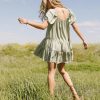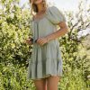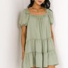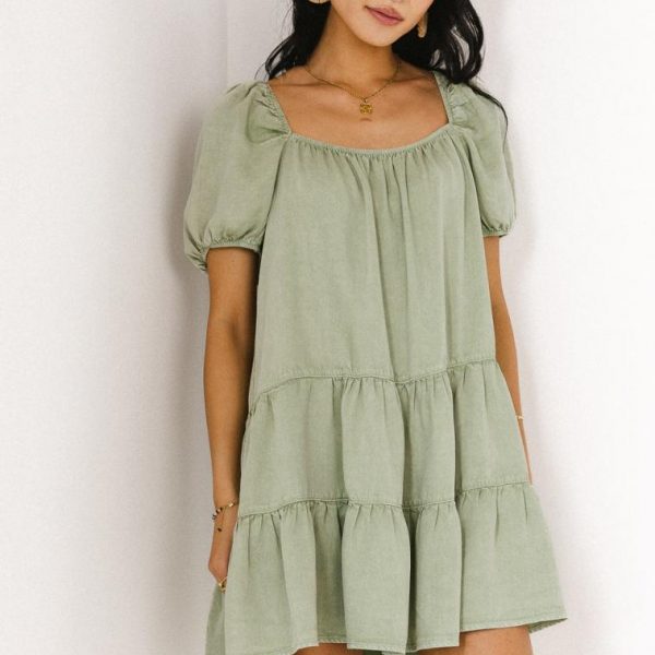Elastic Square Neckline Elastic Shoulders  Puff Sleeves with Elastic Cuffs Two Hand Pockets Tiered Skirt with Gathers Unique Dye Treatment Non-Stretch Material 100% Lyocell Hand Wash Cold, Hang Dry  The Jordy Tiered Mini Dress is about to be your sage green staple. This color is so hot this season and a casual mini dress creates a combo you don’t want to miss out on. Complete your look with a pair of strappy heeled sandals. Model Info  Height: 5’7″  Wearing Size: Small